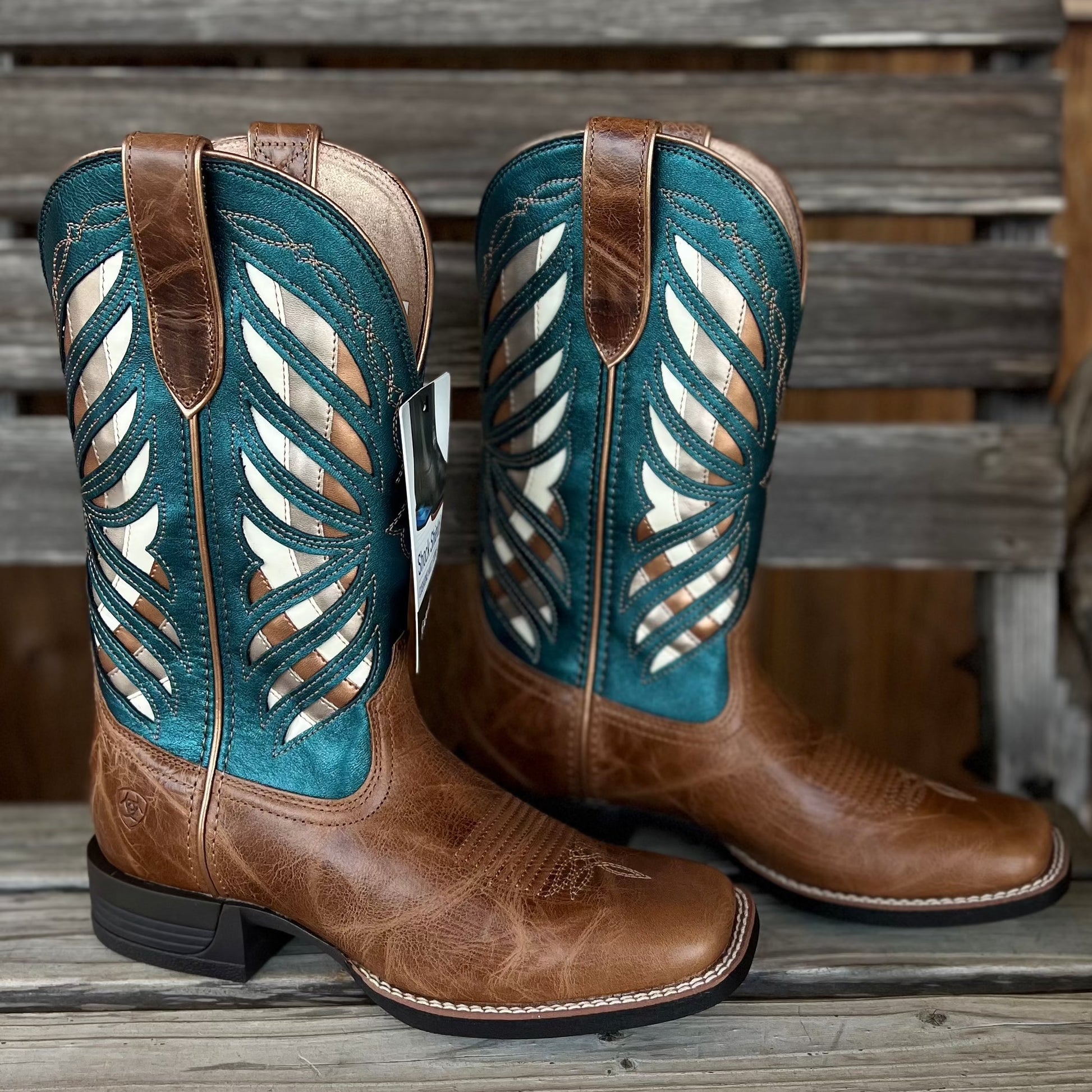 Women's long-view teal metallic top featuring a stylish gold, lavender, and cream inlay.