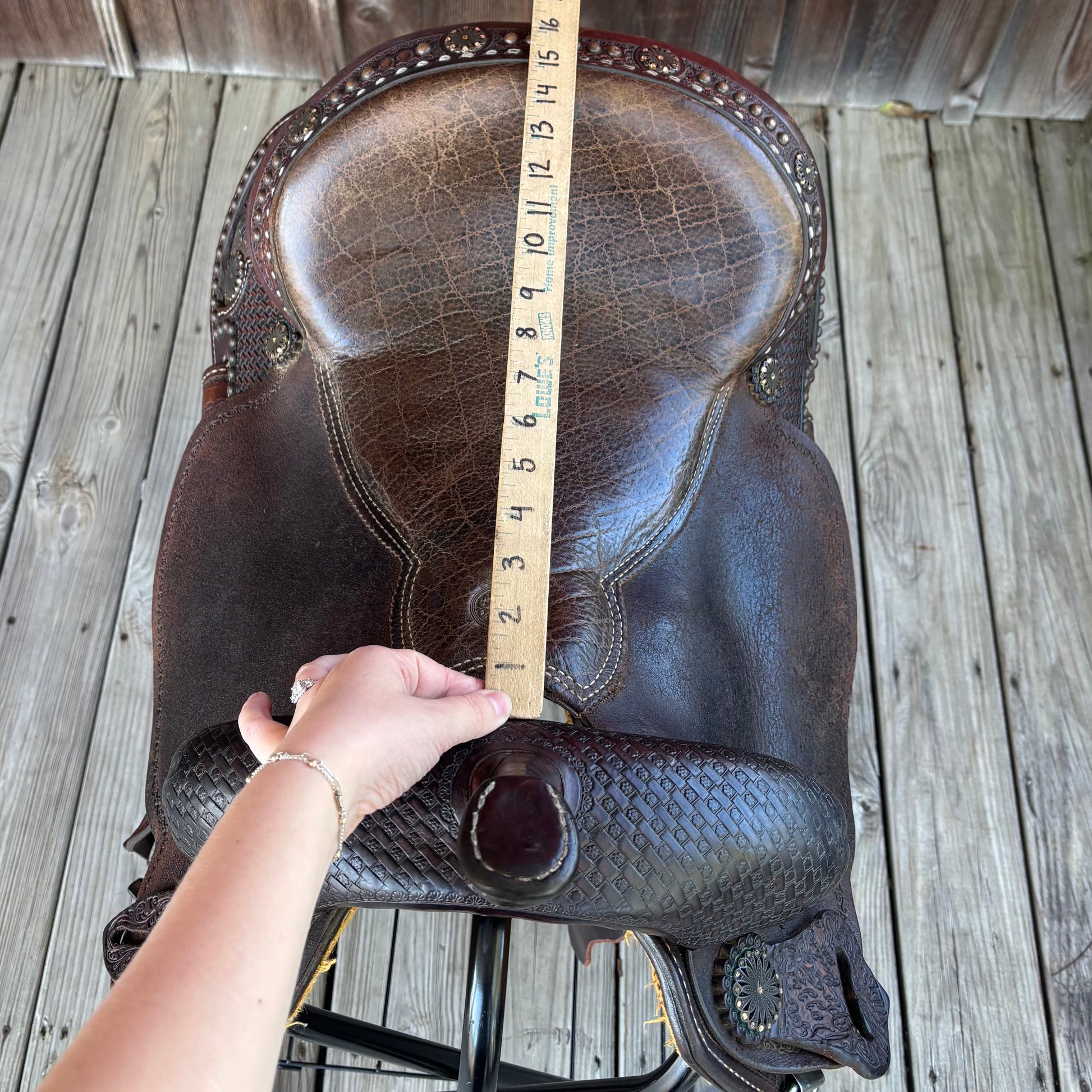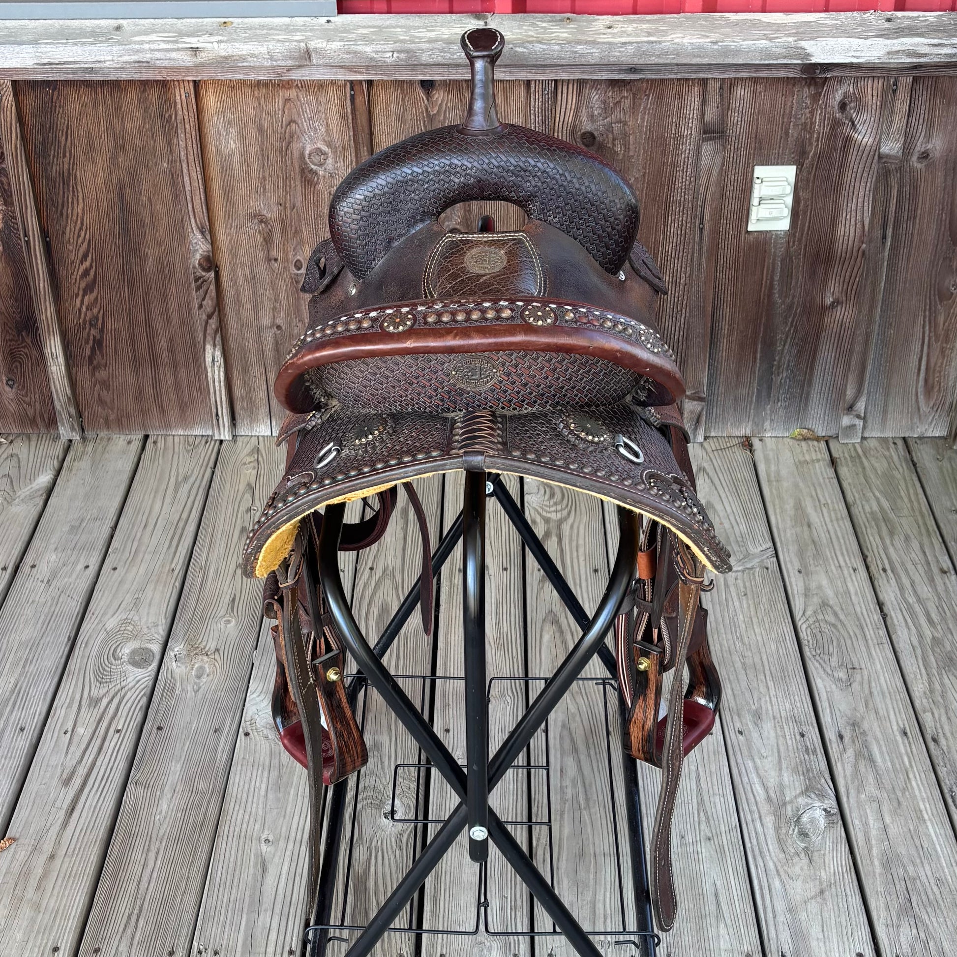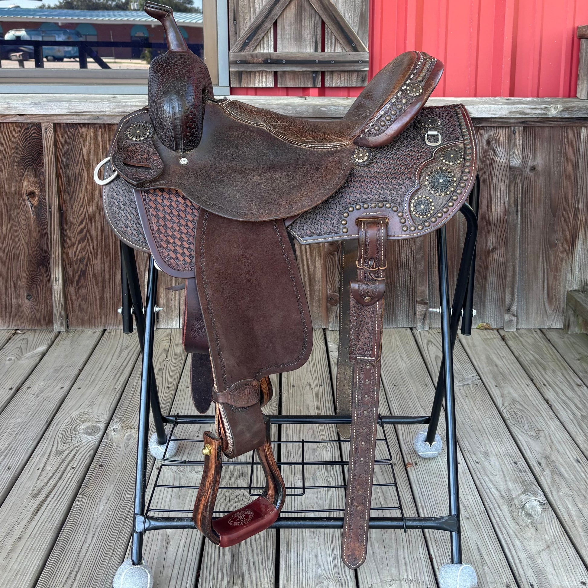 Used 14.5" Double J Pozzi, wide fit, cheyenne roll, elephant print seat, flower basket weave tooling on pommel, skirt, and cantle, brass dots and conchos on cantle and skirt, roughout jockey and fender with a boarder tooling, fleece lined, Nettle stirrups