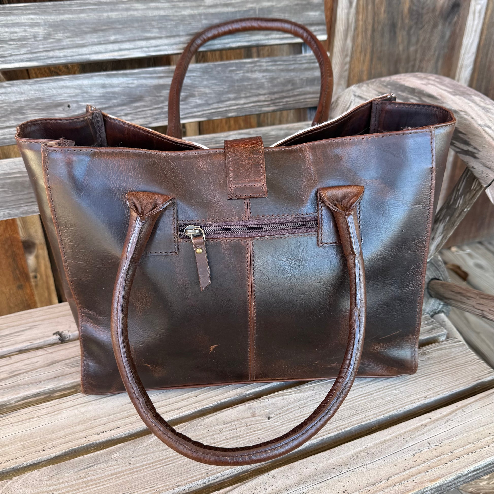 Brown & White Hair on Cowhide Shoulder Bag. This shoulder bag features brown & white hair on cowhide, double shoulder straps, a leather accent bottom with brass foot, outside & inside pockets and a magnetic buckle closure. Measures Approx. 10" H x 13" W.