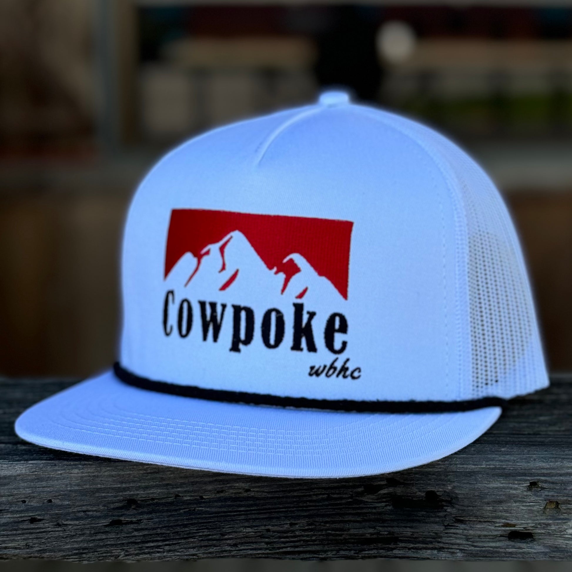 Cowpoke white ball cap with black cord, mesh and snapback with flat bill