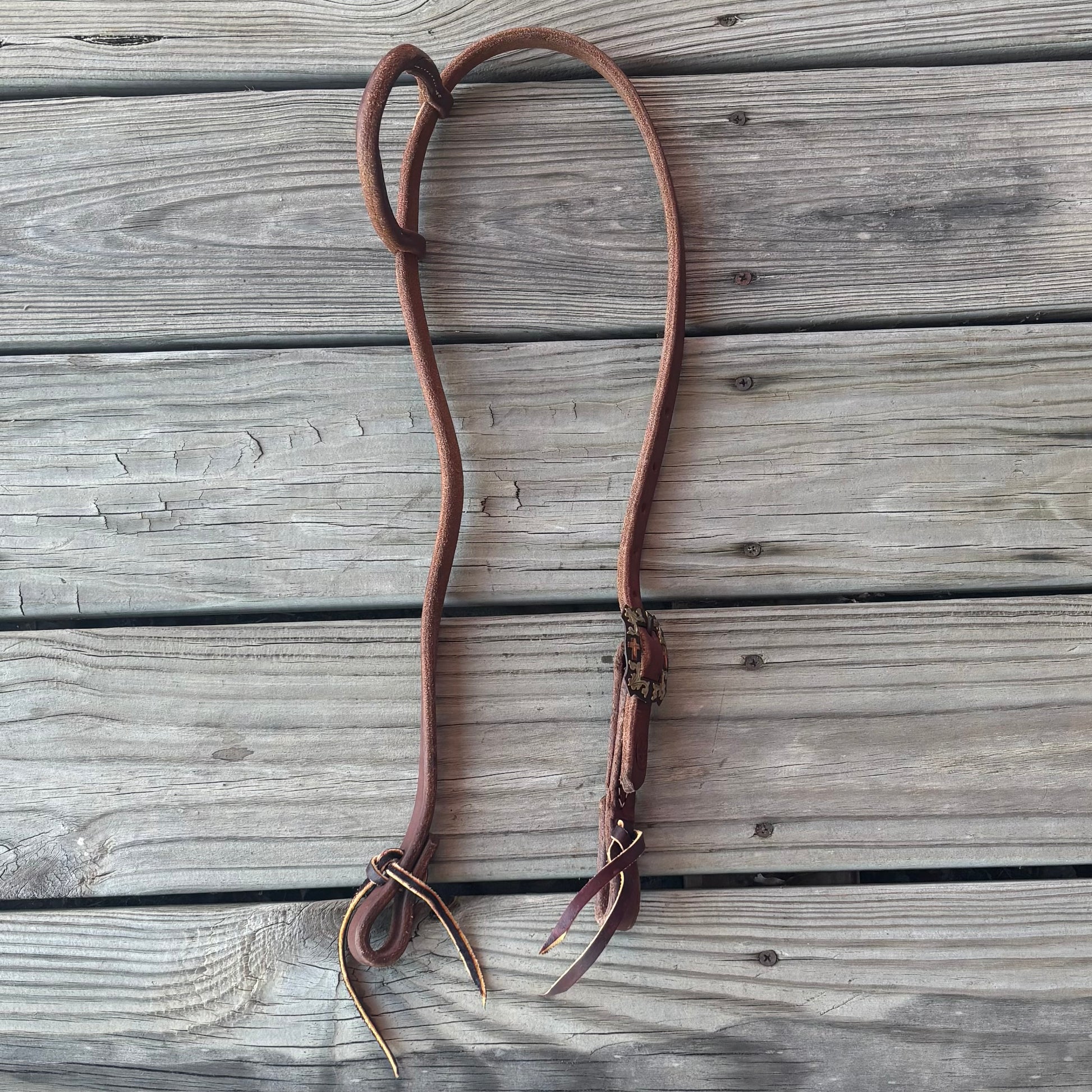 One ear hot oil designer buckle headstall with water loop tie ends with stainless steel buckle cross