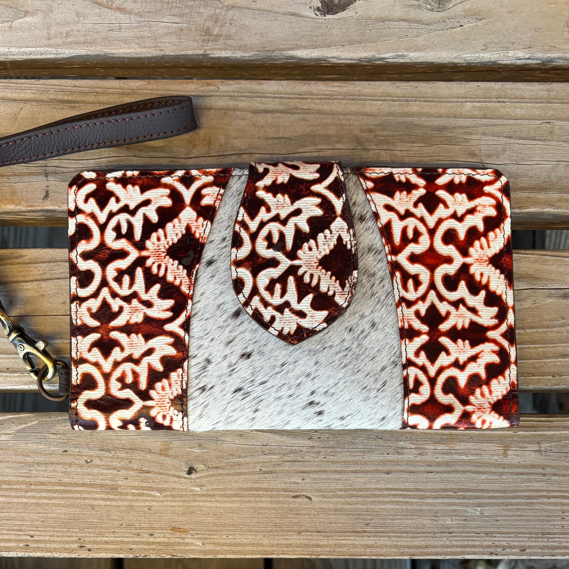 Cowhide clutch Crafted from high-quality pinkish-brown leather, this clutch features a playful and fun design that adds personality to your look. A genuine cowhide inlay enhances its western appeal, making each piece as unique as the rider who carries it. Detachable wristlet strap, Magnetic buckle closure, Features card holder slots and a zipper closure pocket for practical storage. Measures: 8 in. x 5 in.