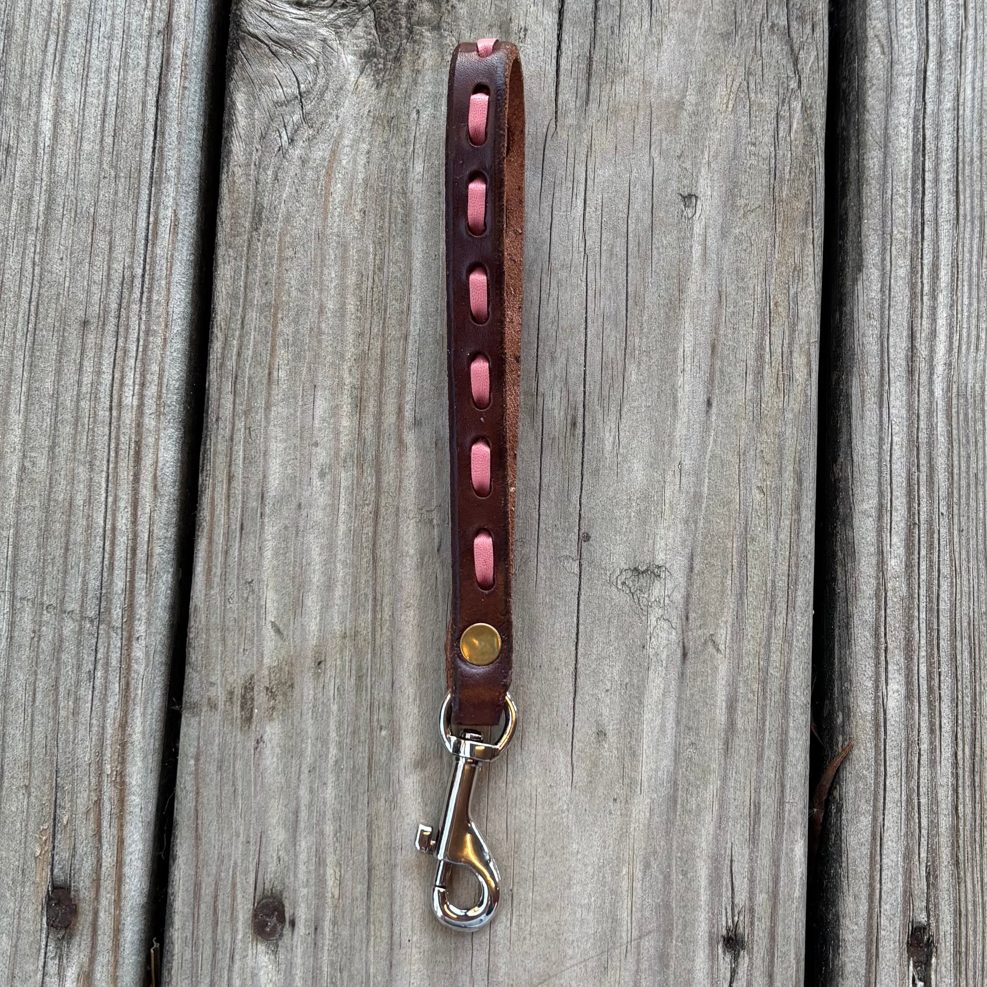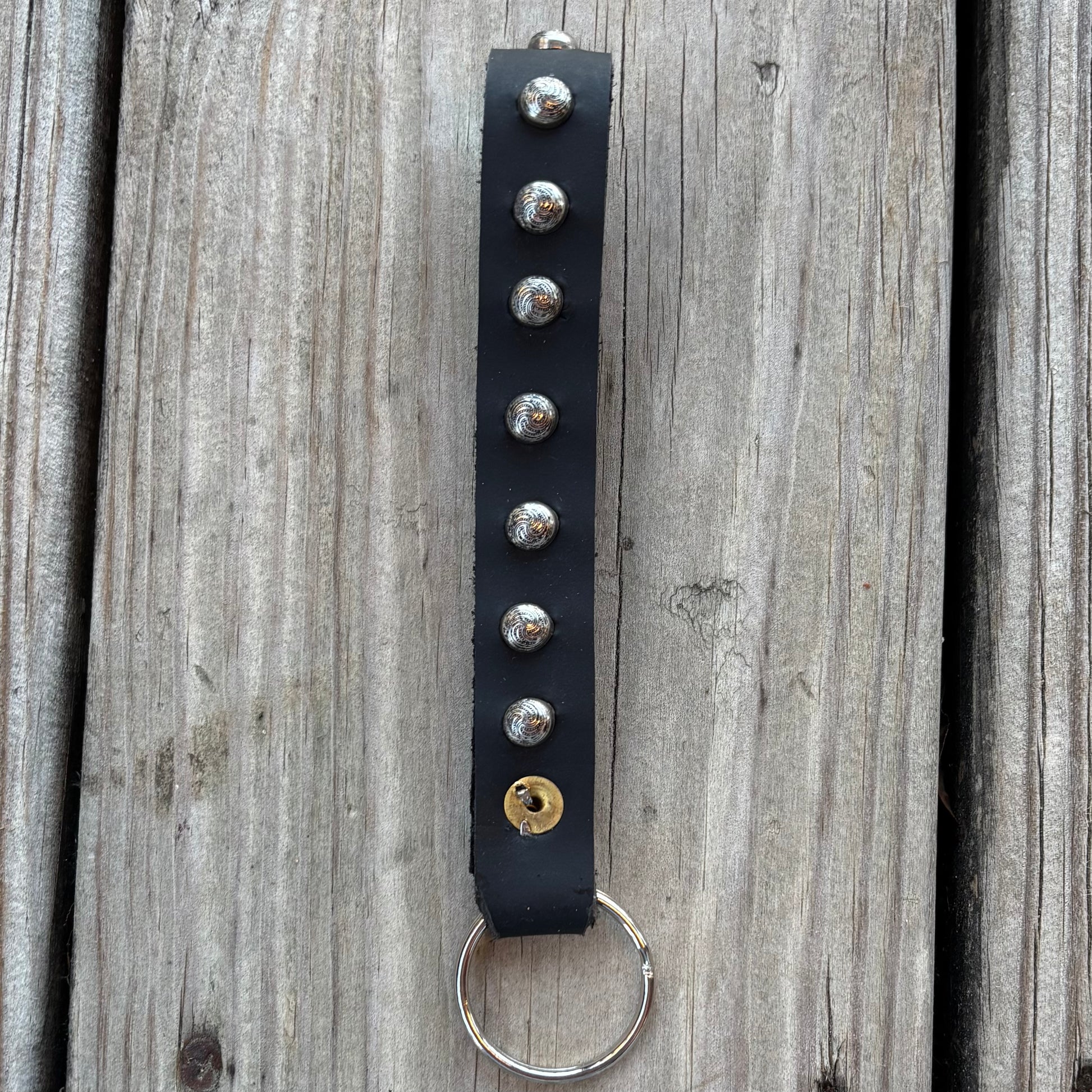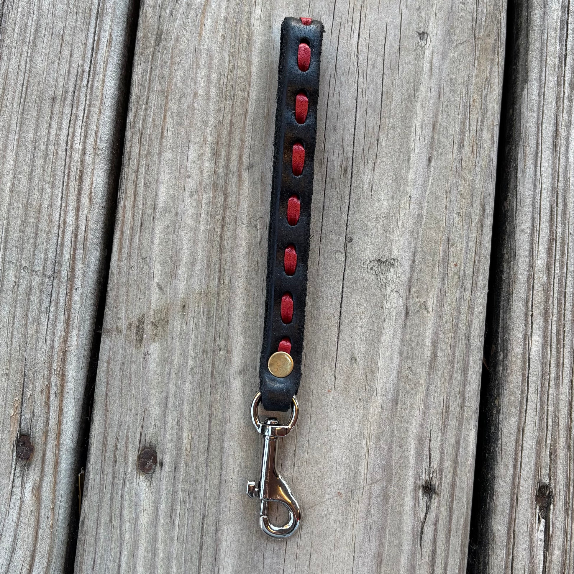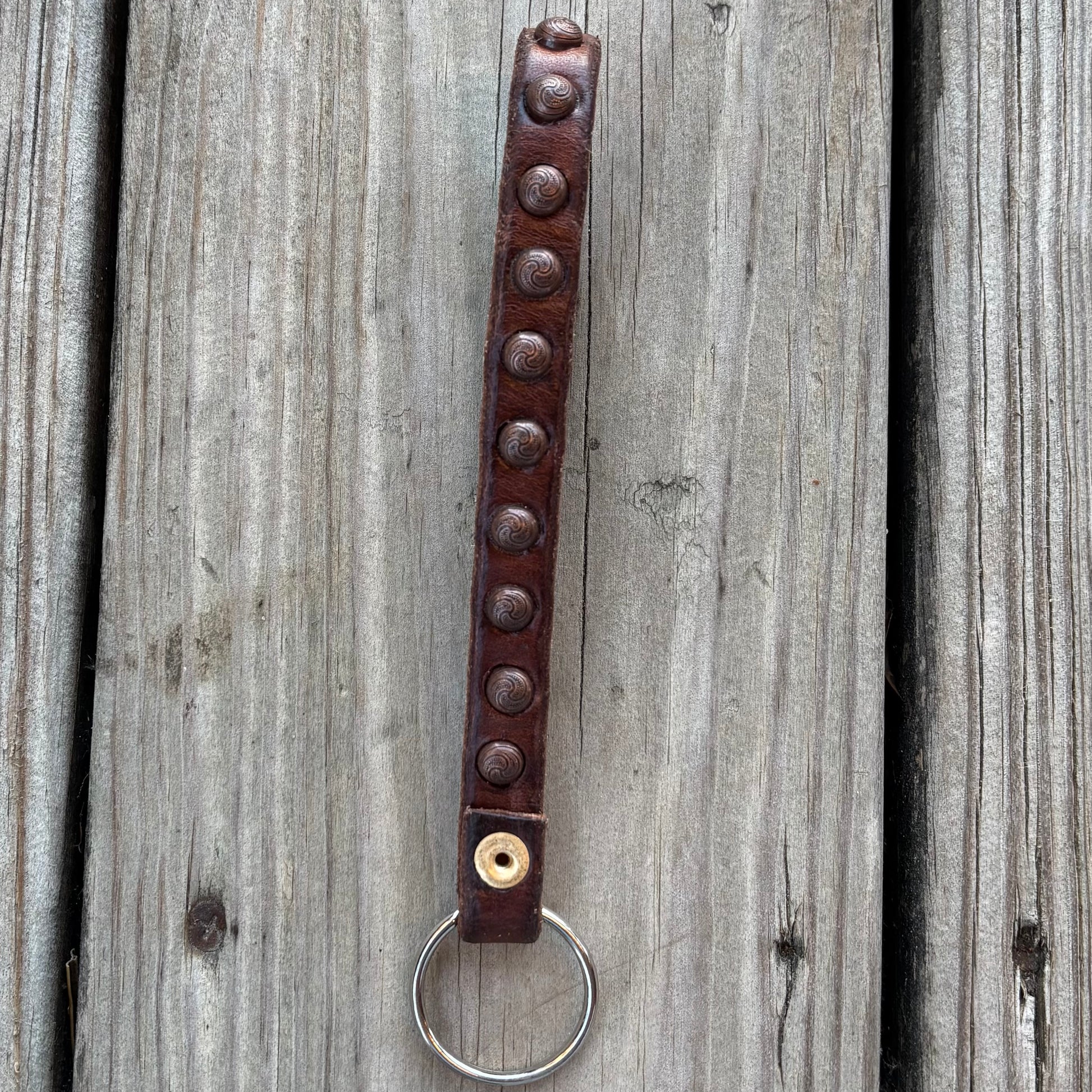 Various leather keychain wristlets with buckstitch, studs, and designs