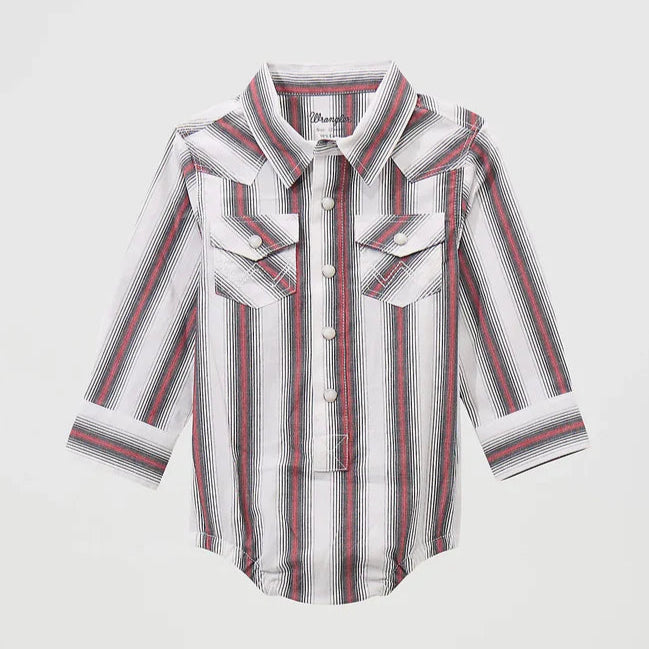 Wrangler baby boy infant onesie long sleeve button up white and red vintage stripe, snap closure, 98% Cotton 2% Spandex