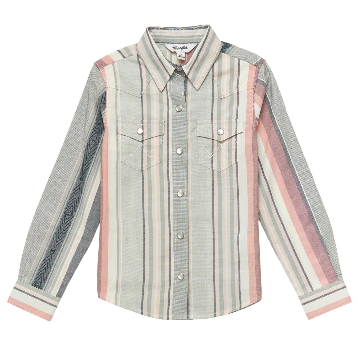 Little girls vintage striped long sleeve with snaps in a grey, blue, and pink color. 53% cotton, 47% rayon.